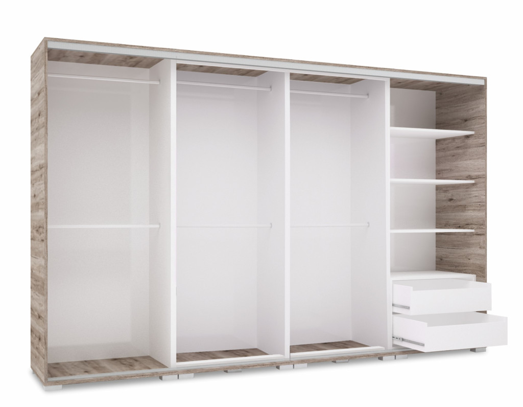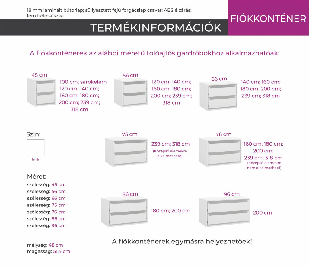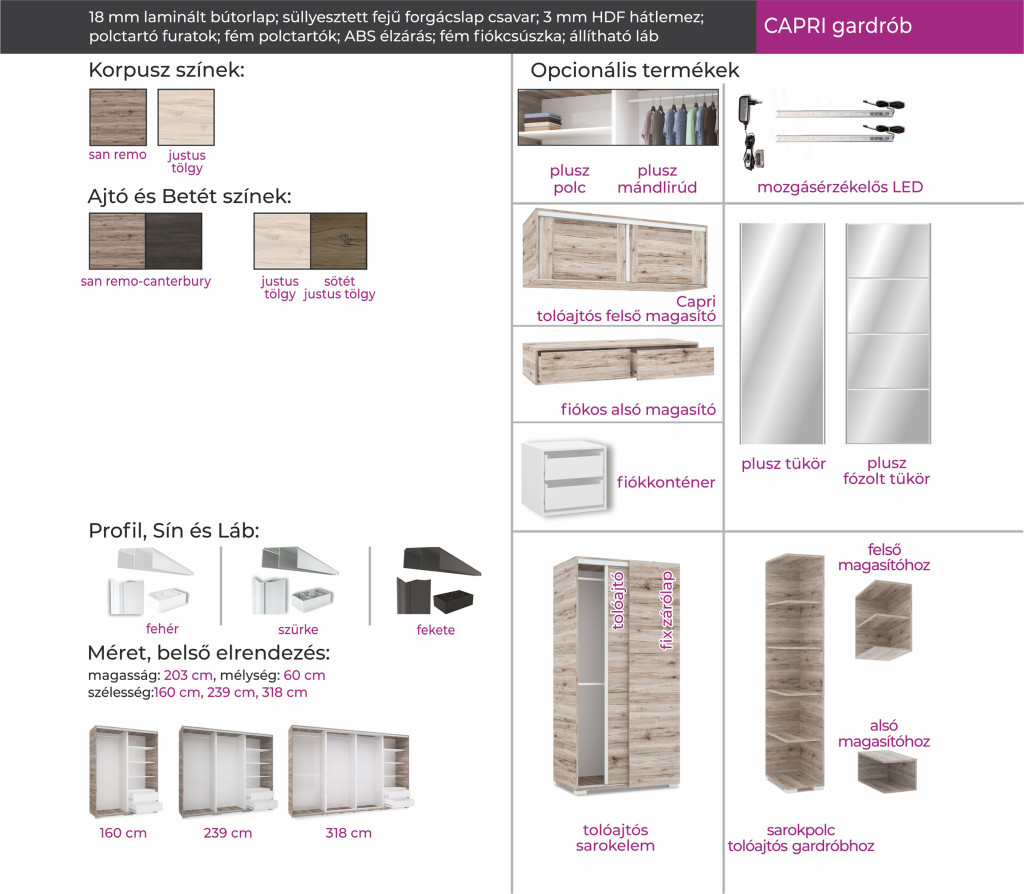 A Capri gardrób 160, 239 és 318 cm-es kivitelben kapható, san remo-canterbury vagy justus tölgy-sötés justus tölgy színvariációban. Esztétikus megjelenése mellett a tárolási kapacitása sem elhanyagolható. Opcionálisan választható termékek: – sarokpolc – tolóajtós sarokelem – fózolt tükör – tükör – fiókos alsó magasító – tolóajtós felső magasító.