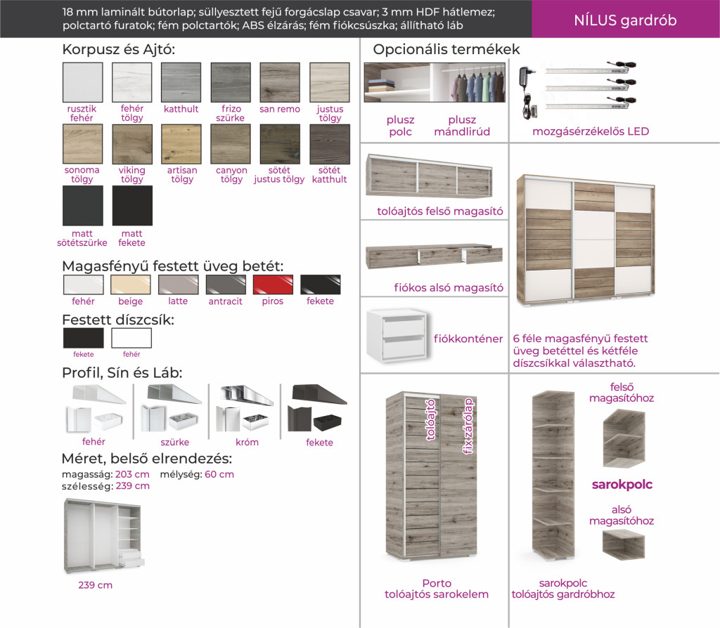 Bárki a maga ízlésére szabhatja a gardrób megjelenését. Opcionálisan választható termékek: – sarokpolc – tolóajtós sarokelem – fiókos alsó magasító – tolóajtós felső magasító.